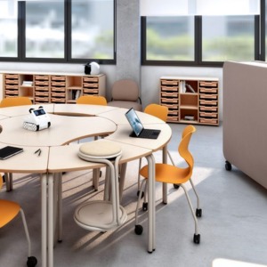 Une étude de Mercier, Higgins et Joyce-Gibbons (2016) comparant des classes organisées de façon traditionnelle et des classes à disposition centrale, a conclu que les résultats aux tâches d'apprentissage étaient similaires dans les deux contextes. Mais là où les deux organisations divergent, c'est sur les interactions et l'engagement des élèves qui sont nettement favorisés dans les espaces flexibles."